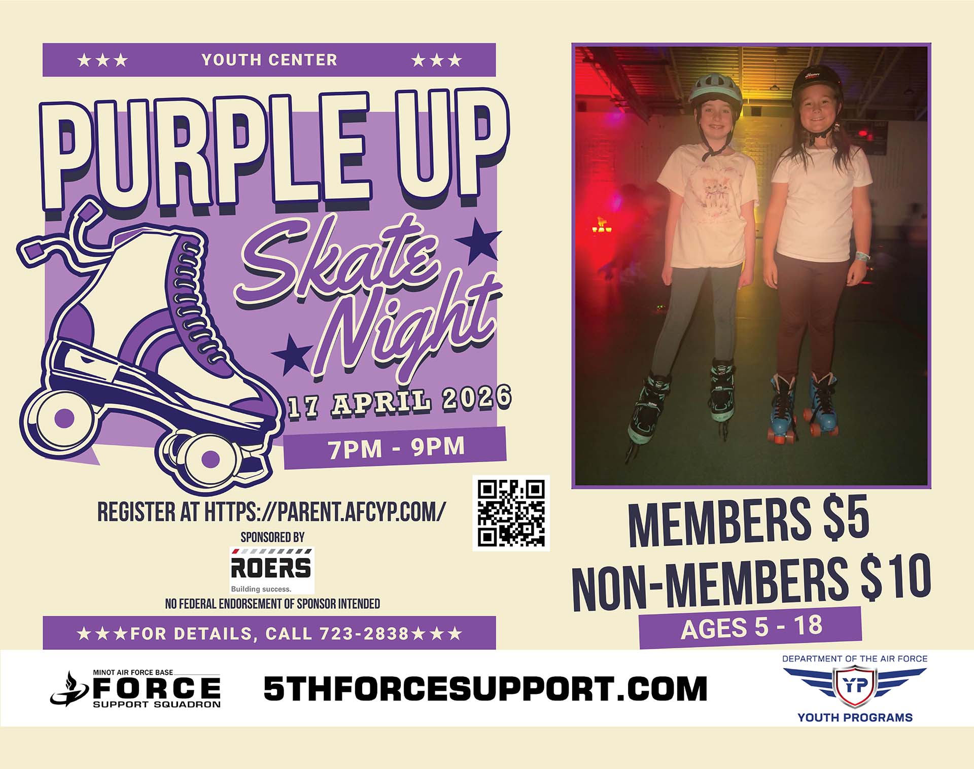 The Month of the Military Child events continue with the Purple Up Skate Night at the Youth Center on 17 April 2026 from 7:00PM โ 9:00PM!